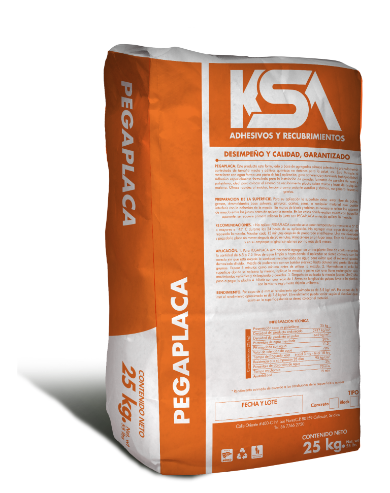 PEGAPLACA. Este producto esta formulado a base de agregados pétreos selectos de granulometría controlada de tamaño medio y aditivos químicos no dañinos para la salud, etc. Esta fórmula al mezclarse con agua forma una pasta de fácil aplicación, gran adherencia y excelente trabajabilidad. Adhesivo especialmente formulado para la instalación de grandes formatos de paneles de yeso y polietileno, ideal para colocar el sistema de recubrimiento placka sobre muros y losas de cualquier materia. Ofrece rapidez al instalar, funciona como aislante acústico y térmico, no genera fisuras o grietas.